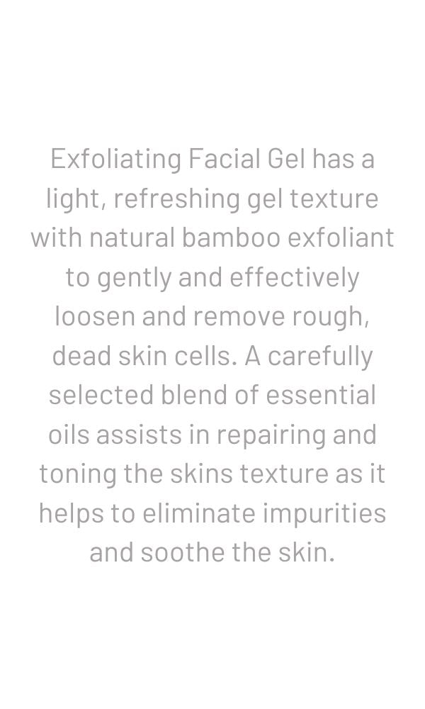 Exfoliating Facial Gel has a light, refreshing gel texture with natural bamboo exfoliant to gently and effectively loosen and remove rough, dead skin cells. A carefully selected blend of essential oils assists in repairing and toning the skins texture as it helps to eliminate impurities and soothe the skin.