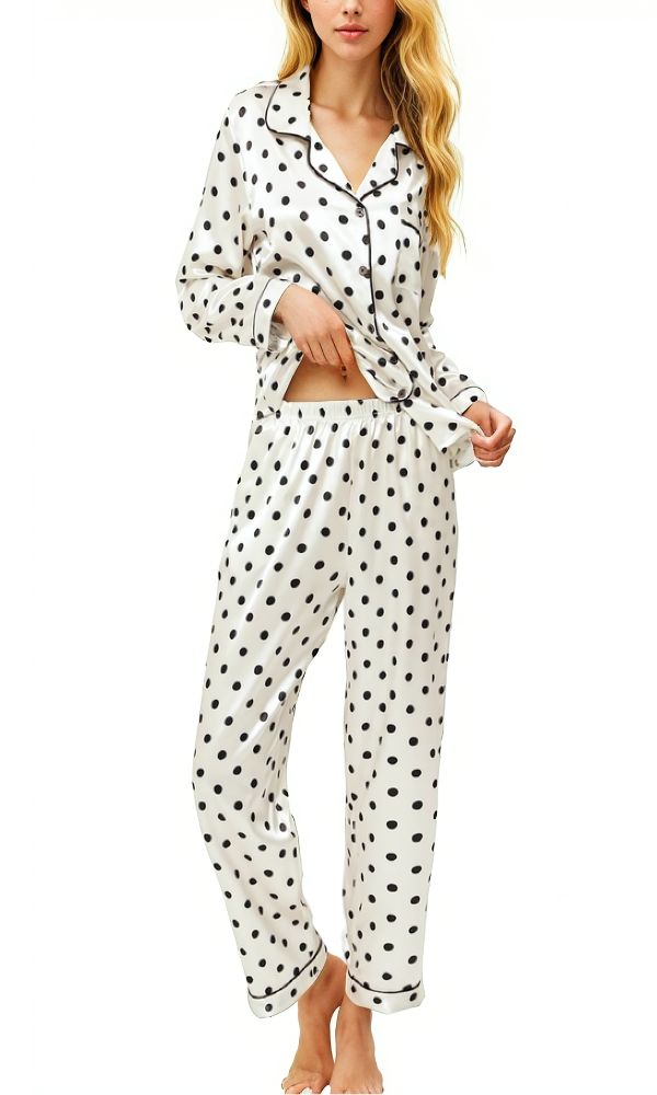Silky white and black dot sateen PJ set with contrast black piping detail.